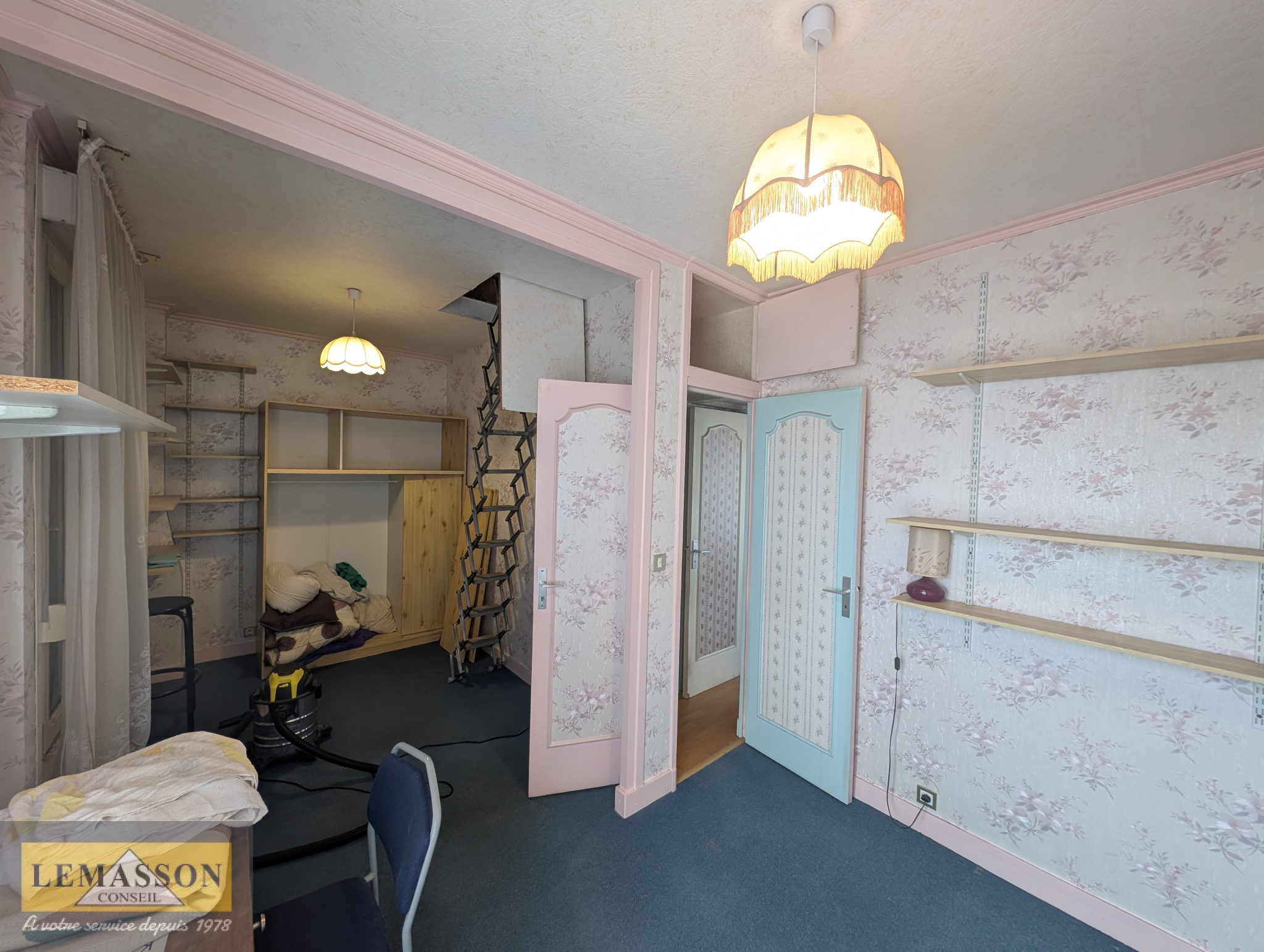 À l’étage, un palier distribue deux chambres dont une avec accès aux combles, ainsi qu’une salle de bains avec WC.