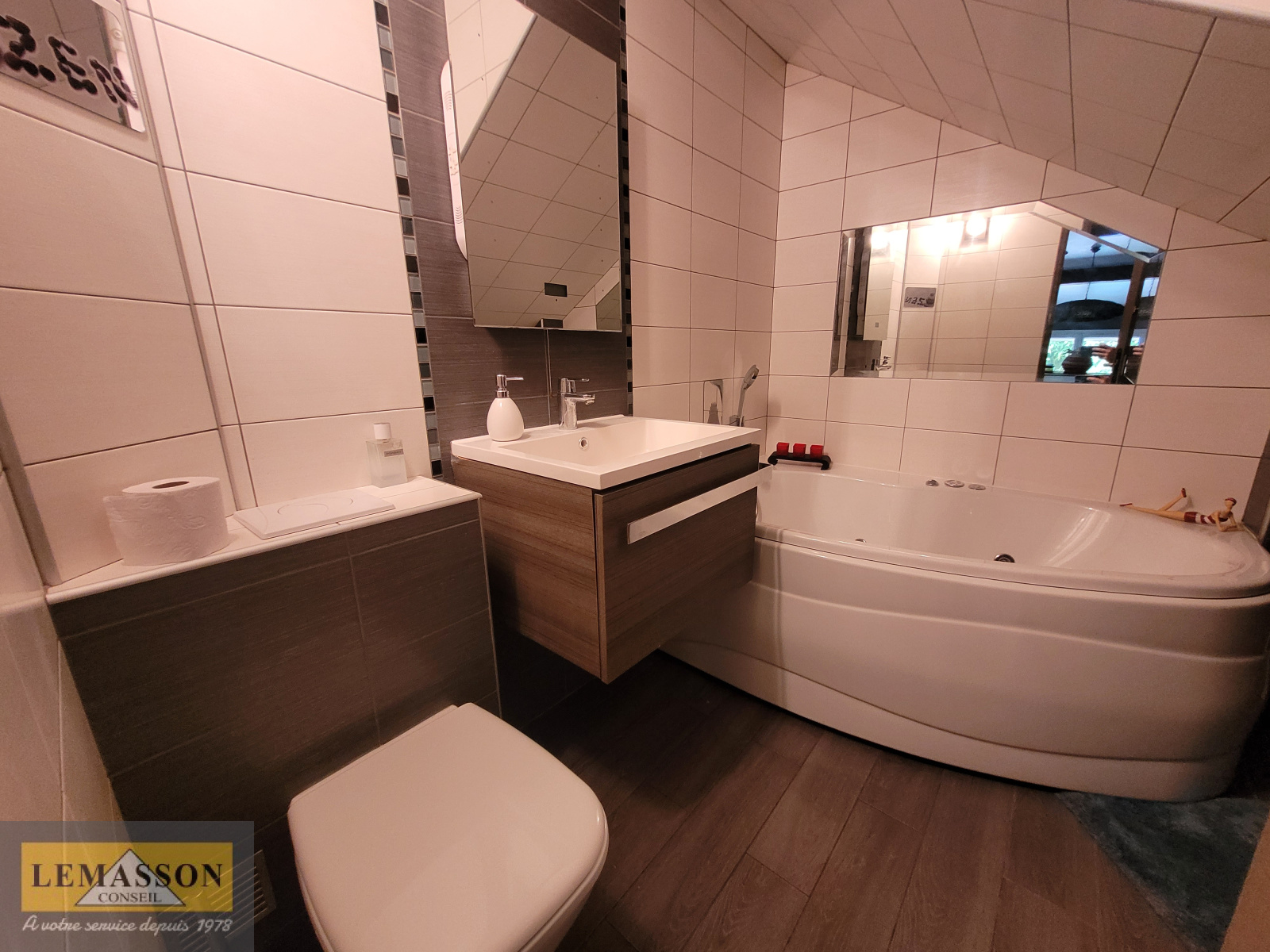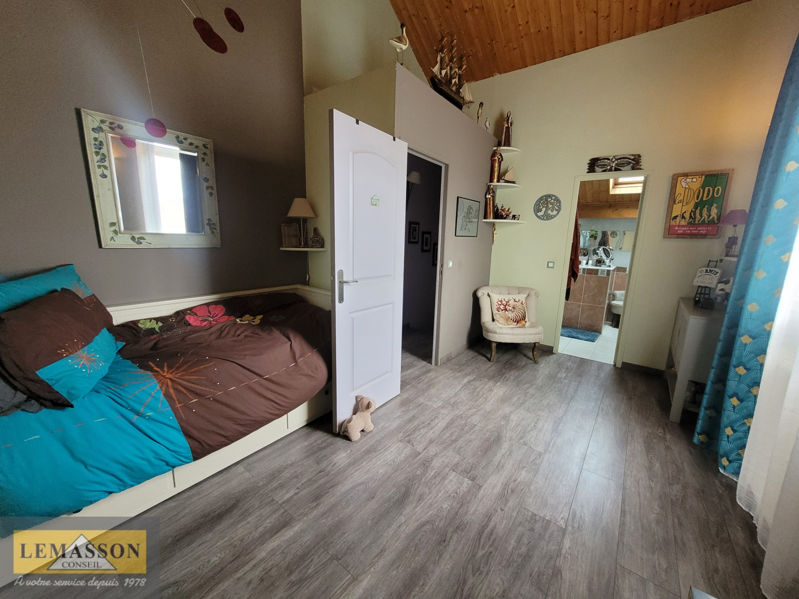 À l'étage, deux chambres sont présentes : l'une avec suite parentale comprenant une salle d'eau avec WC sanibroyeur, et l'autre, mesurant environ 21 m², avec un espace bureau, offrant la possibilité d'aménager une quatrième chambre.