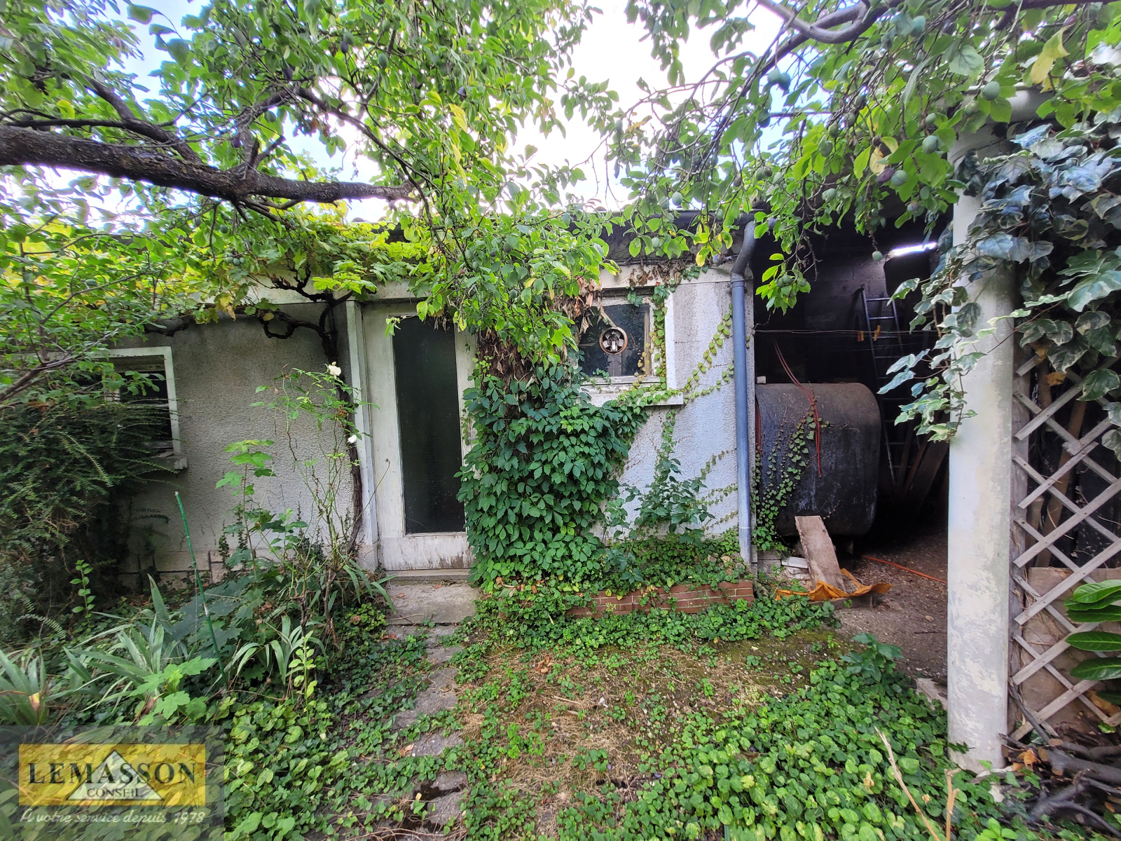 En fond de parcelle, une remise avec pièce d'eau. Abris de jardin.